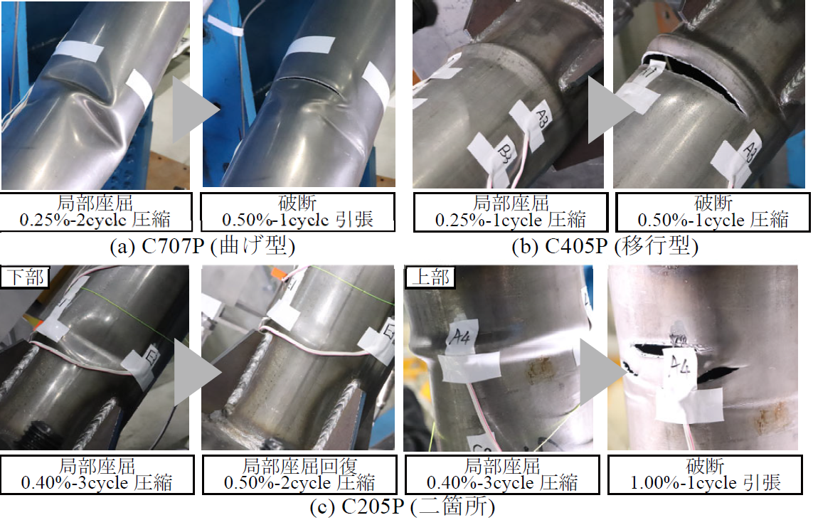 本研究では,径厚比60, 細長比20近傍のパラメータを含む径厚比55や細長比70程度の円形鋼管部材の繰返し載荷実験を行い,実験データベースを拡充し,座屈耐力や座屈性状の分析,座屈後履歴則や破断時期予測手法の適用性検証を行い,最後に有限要素法を用い た局部歪の補完解析を実施しました。論文はこちら